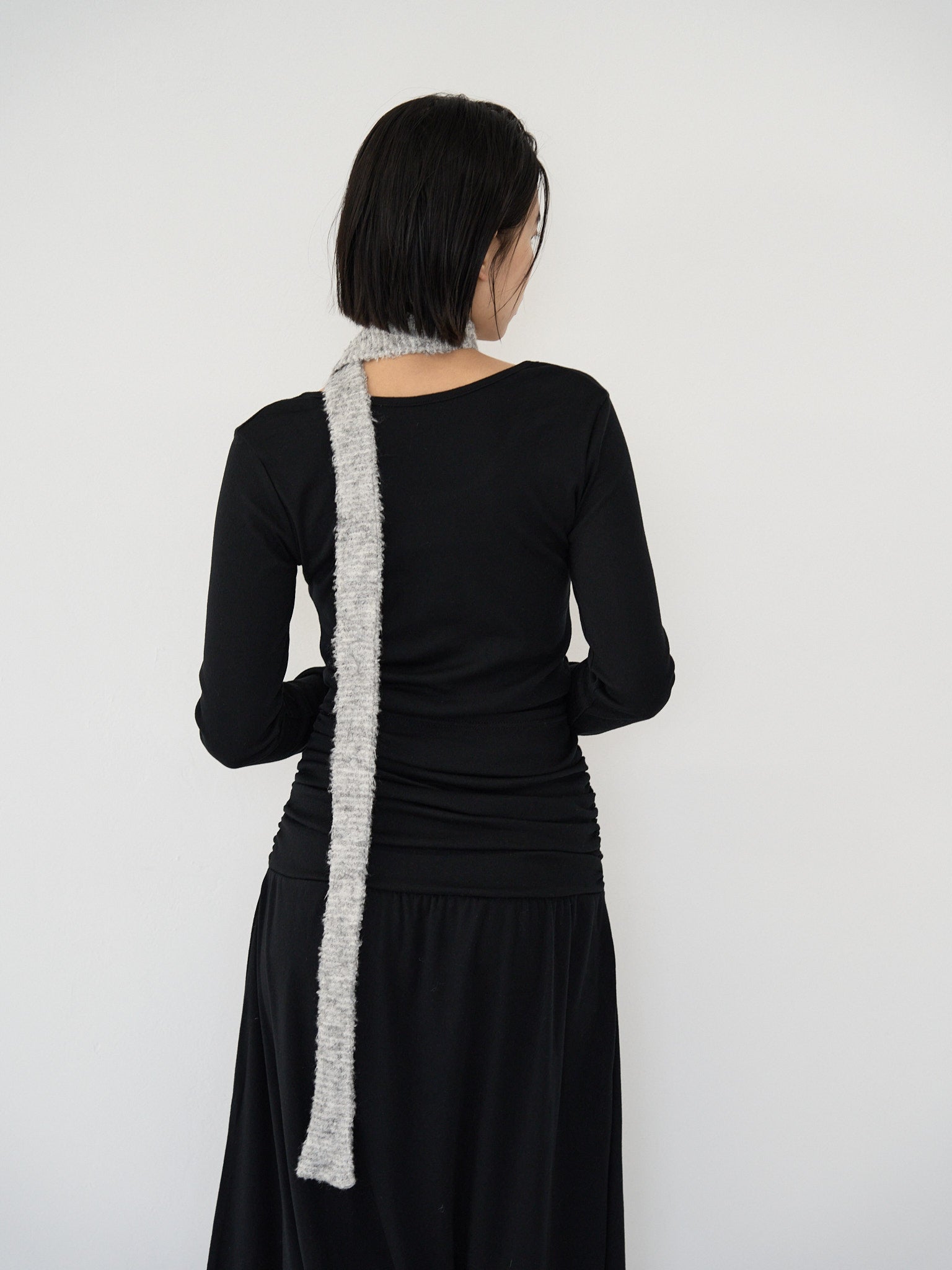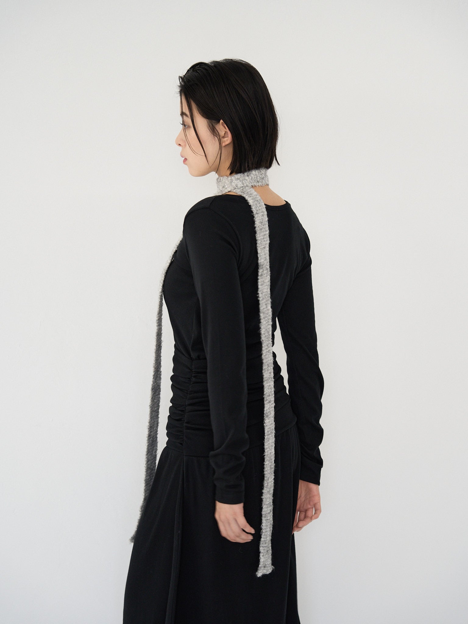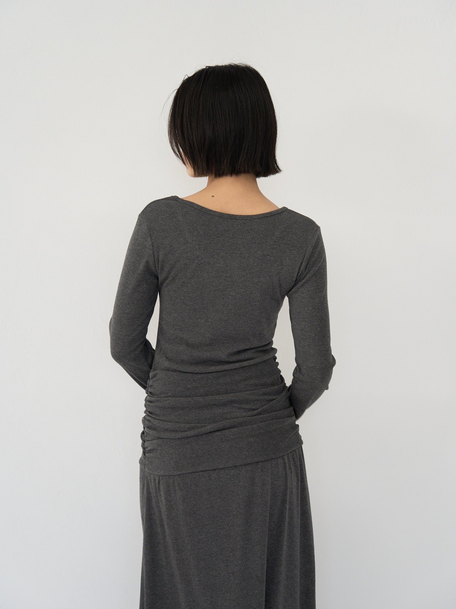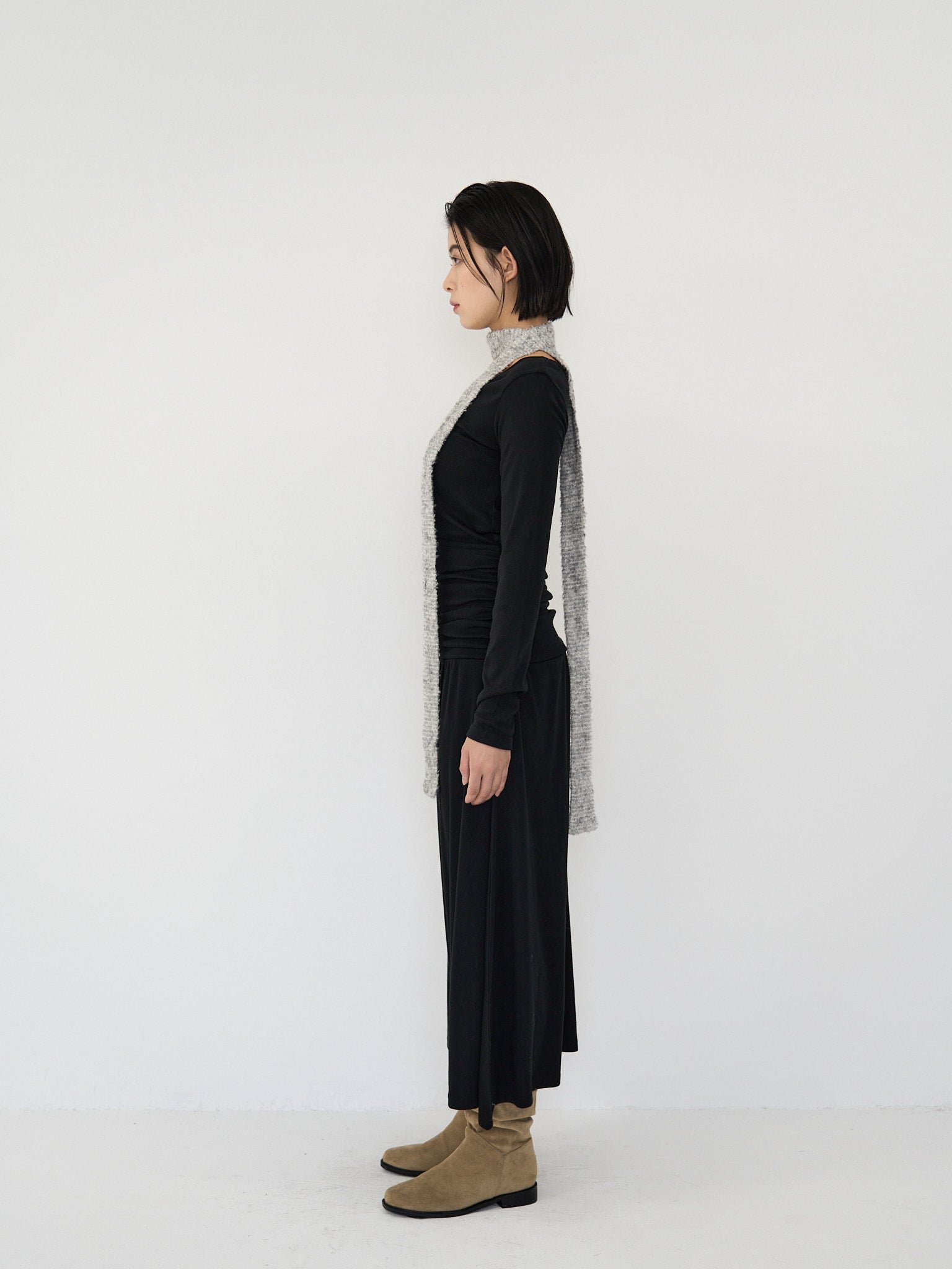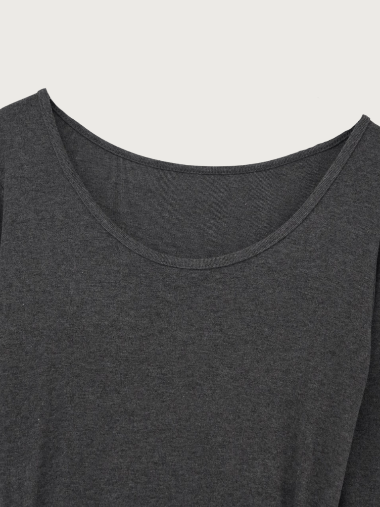 ボートネック風の襟元が程よい抜け感を演出し、女性らしさを引き立てます。