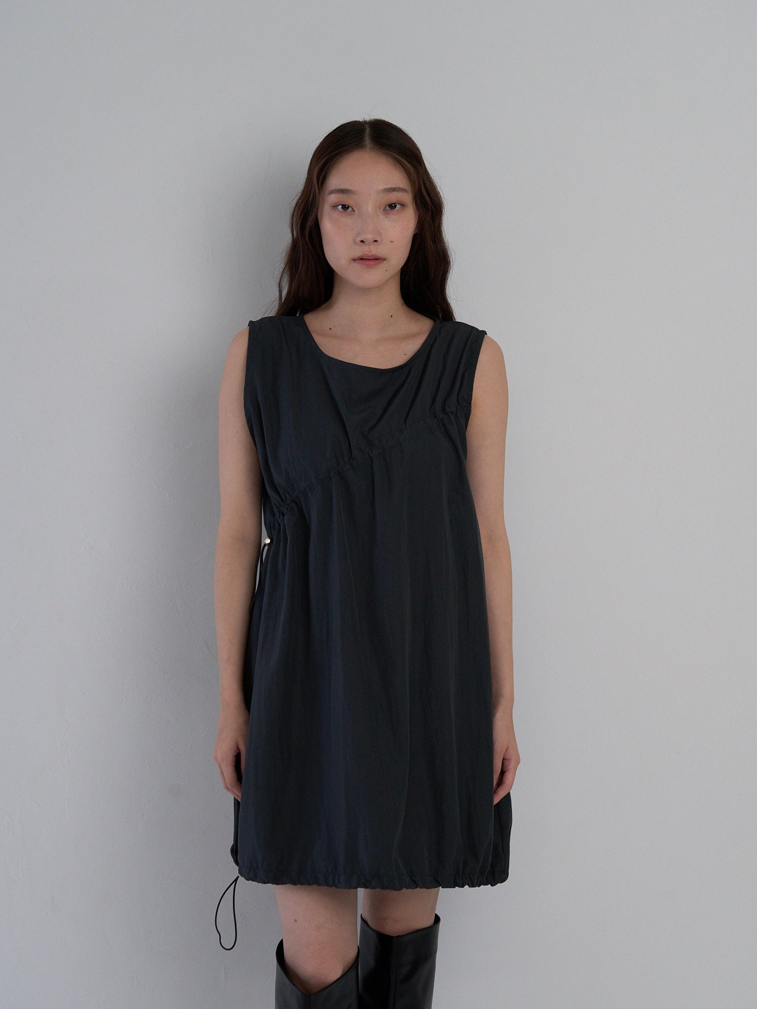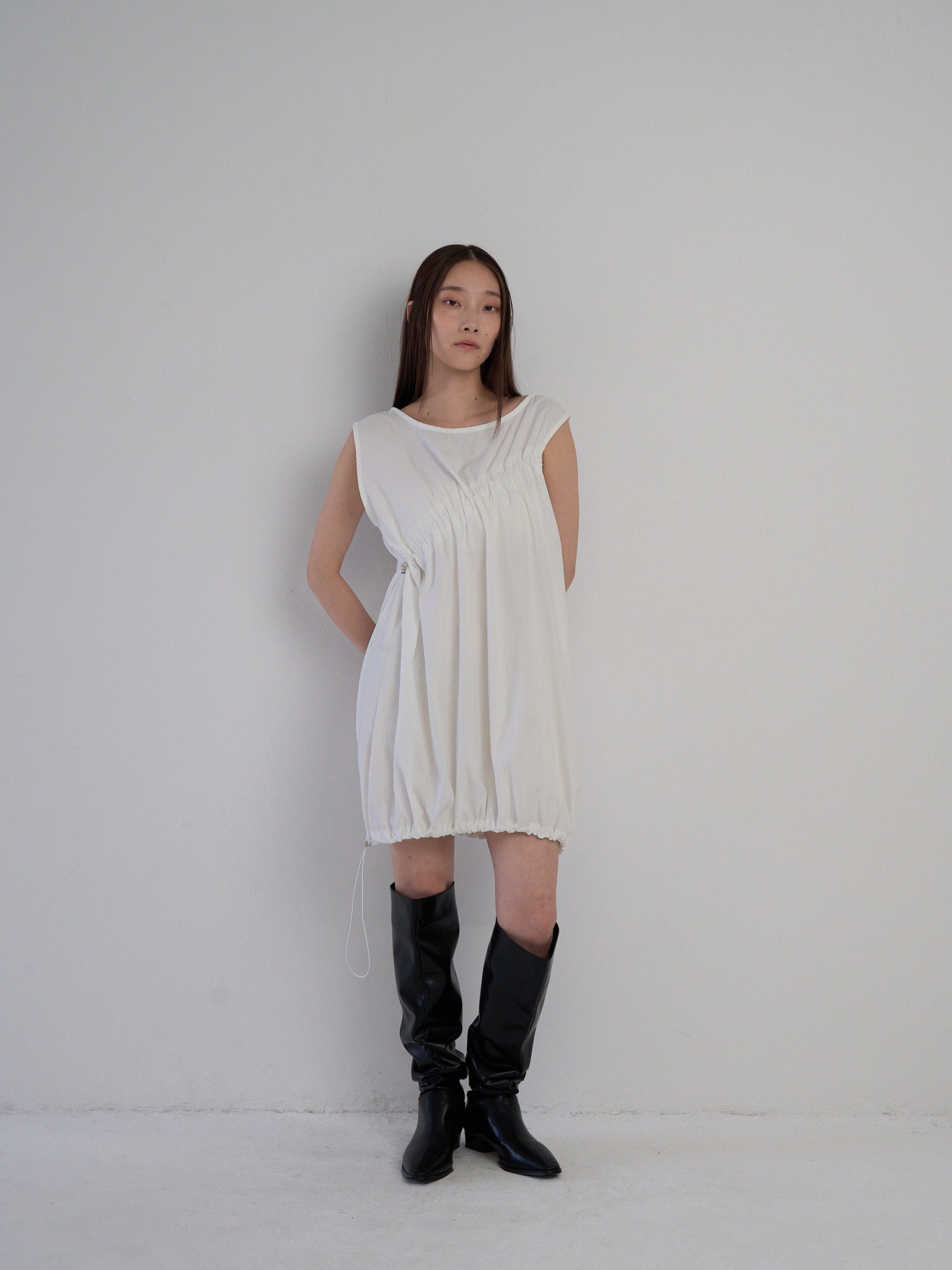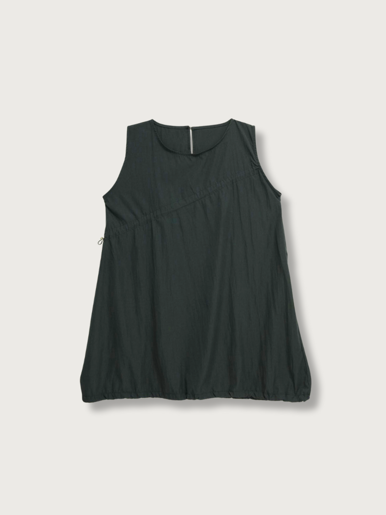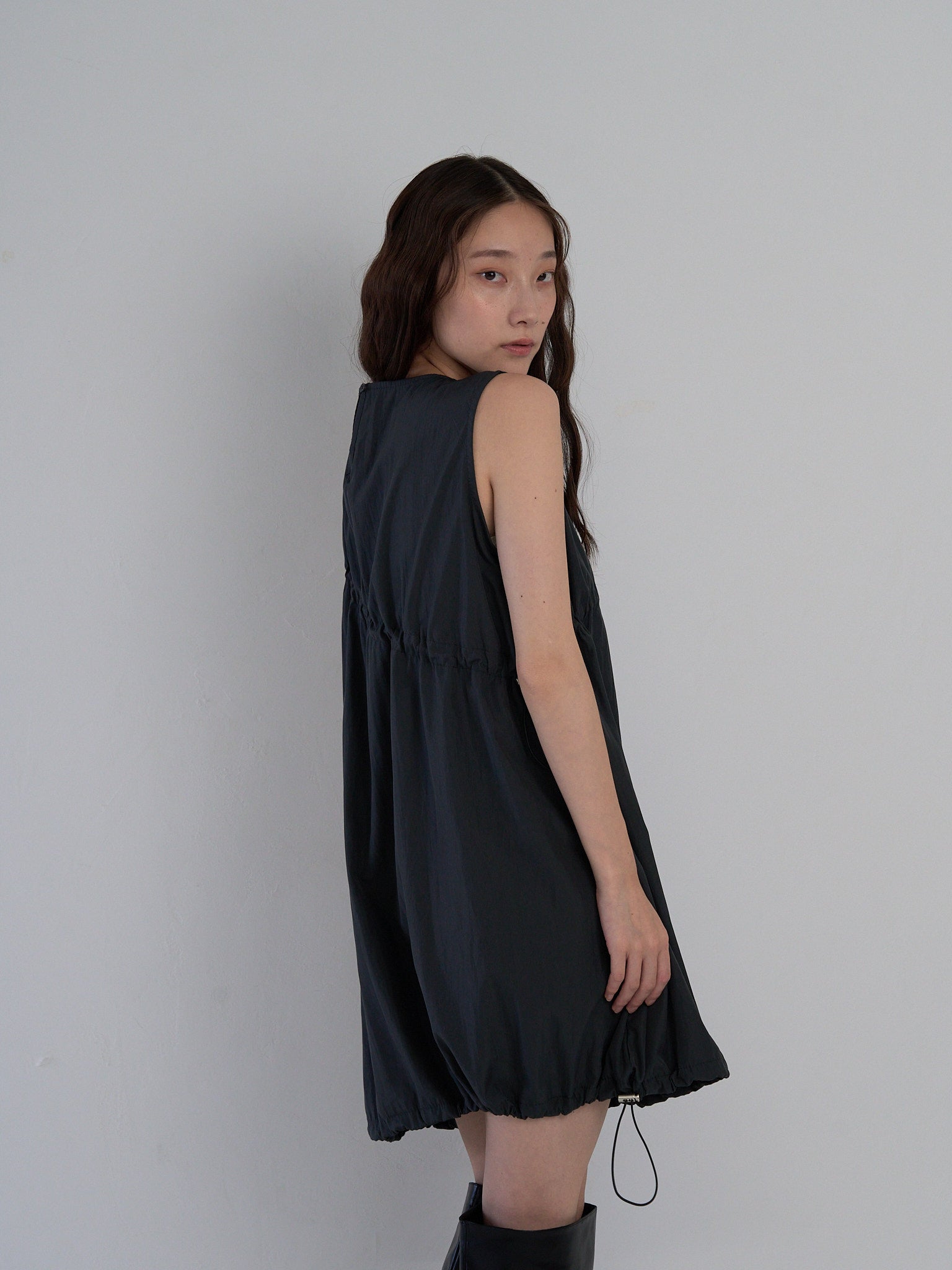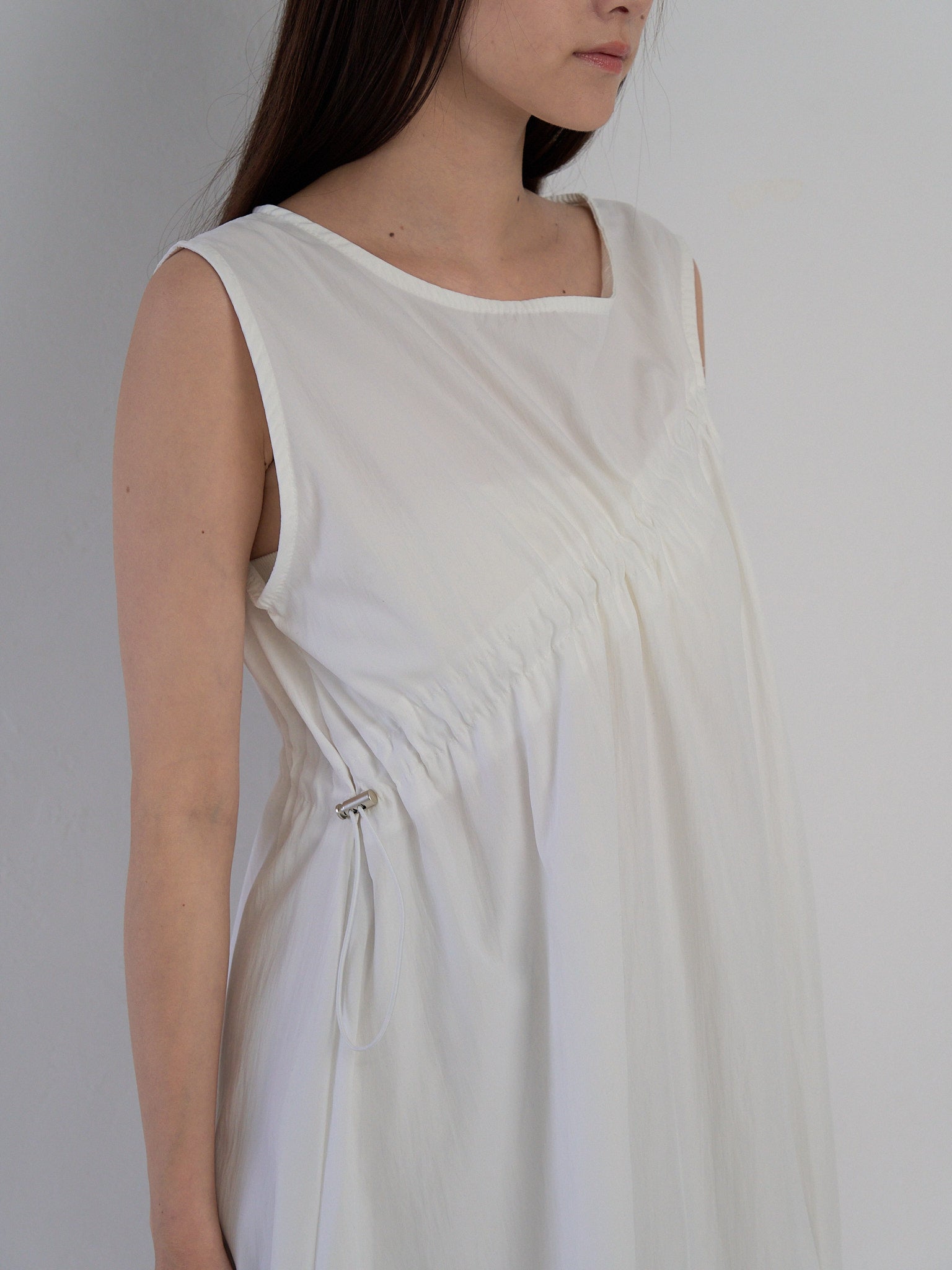 胸元と裾に施されたドローストリングを