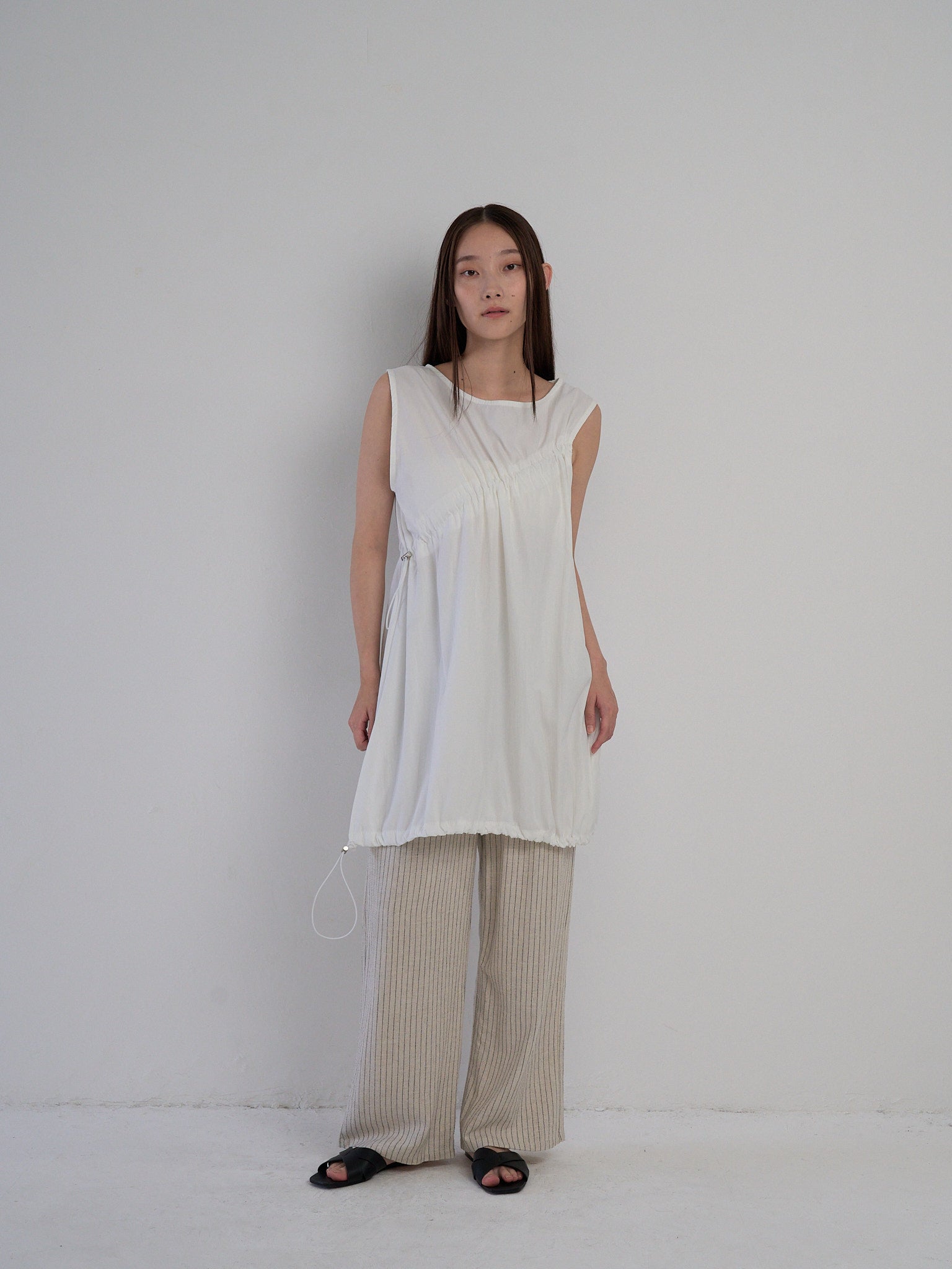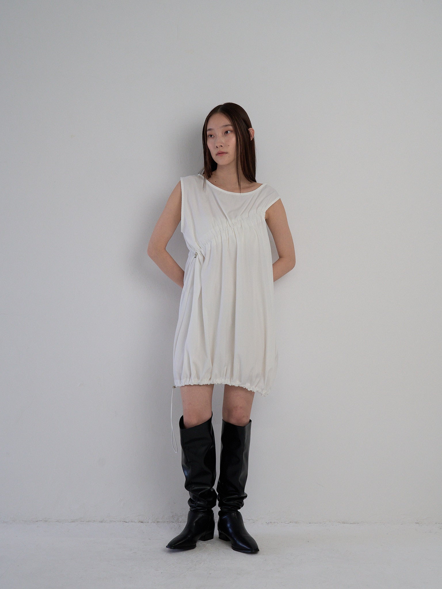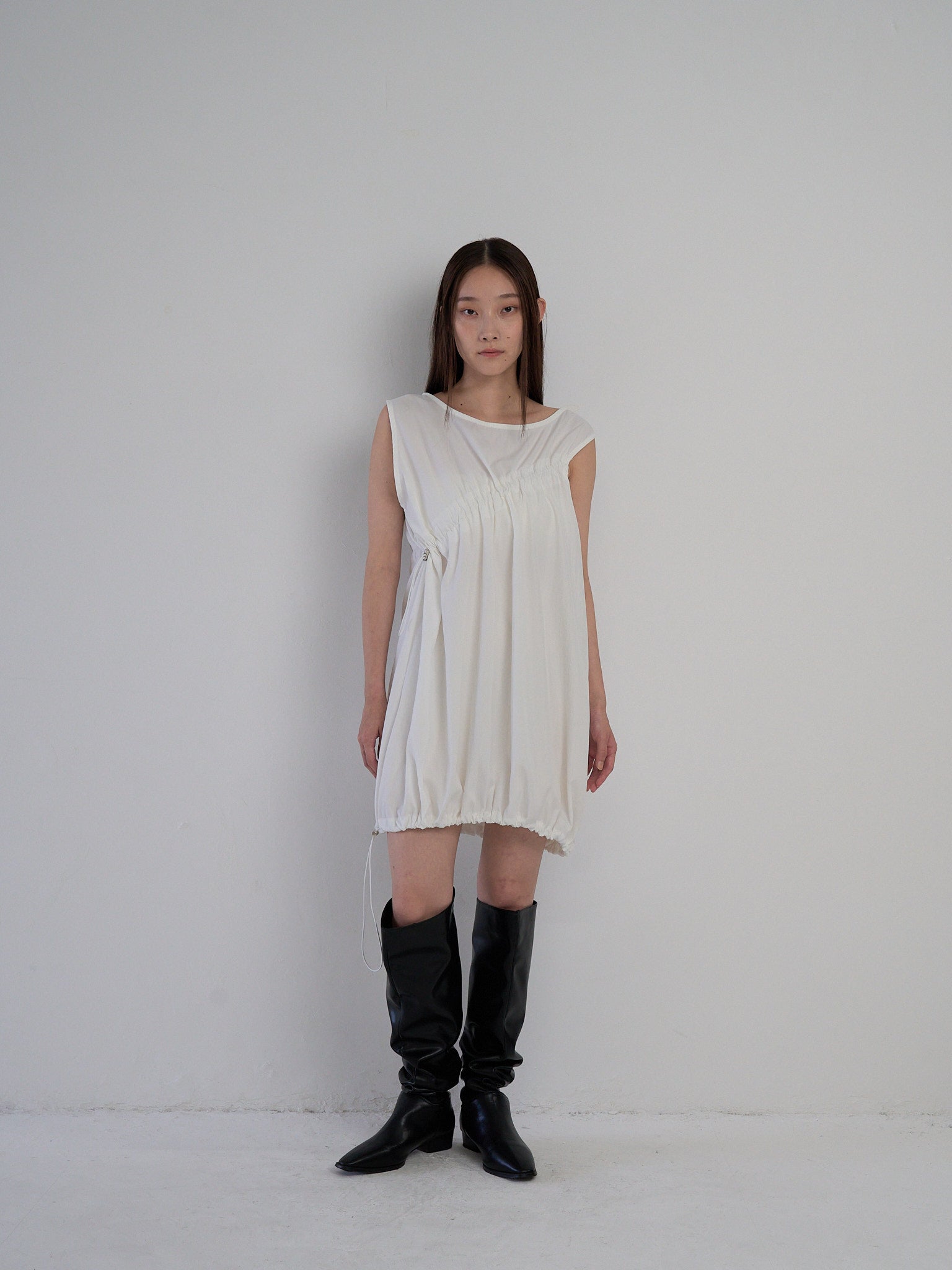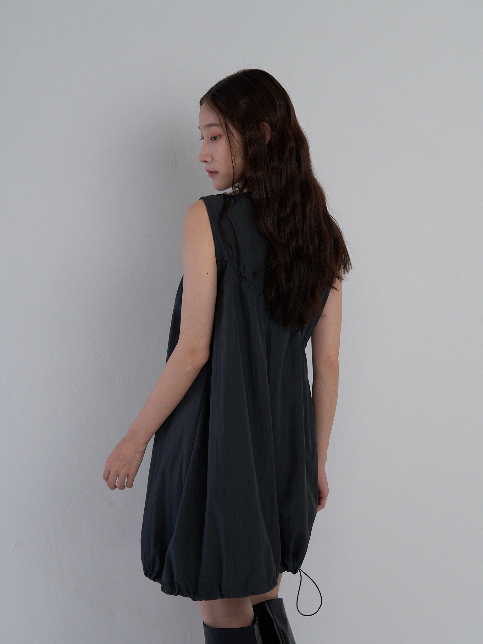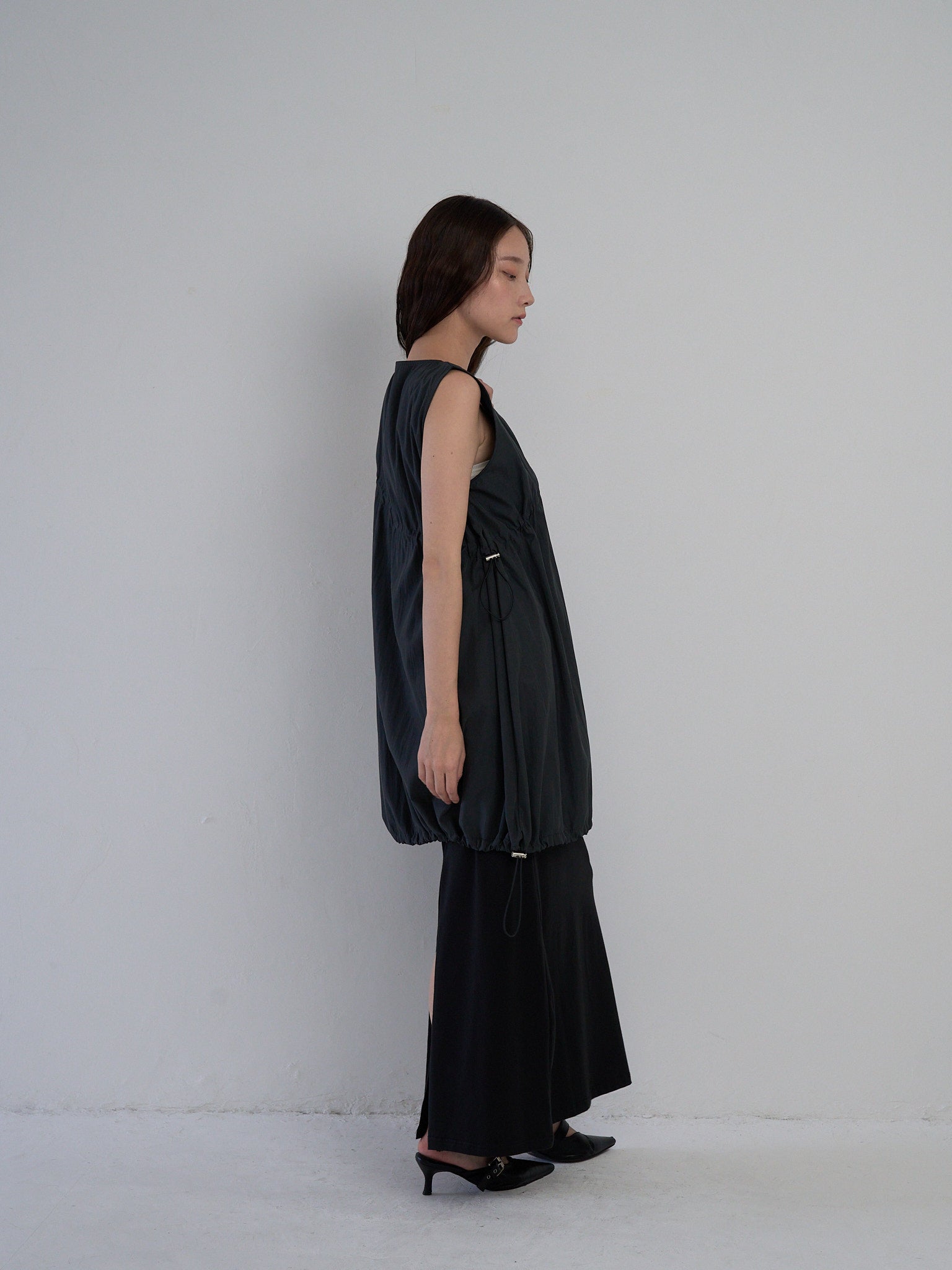 胸元と裾に施されたドローストリングを
