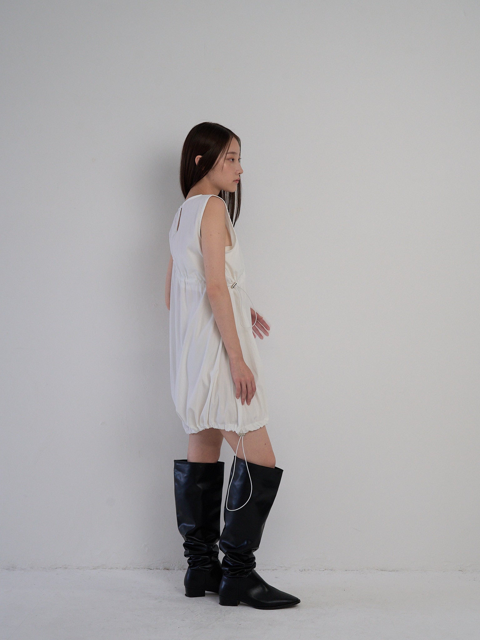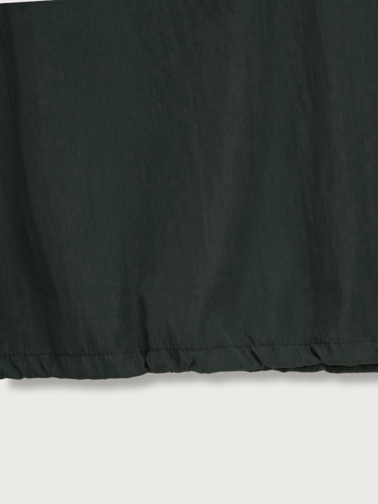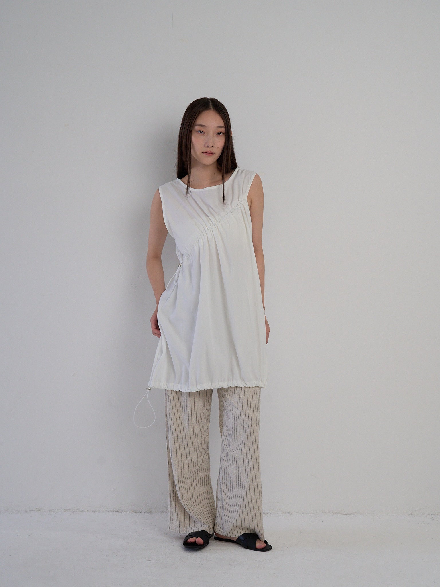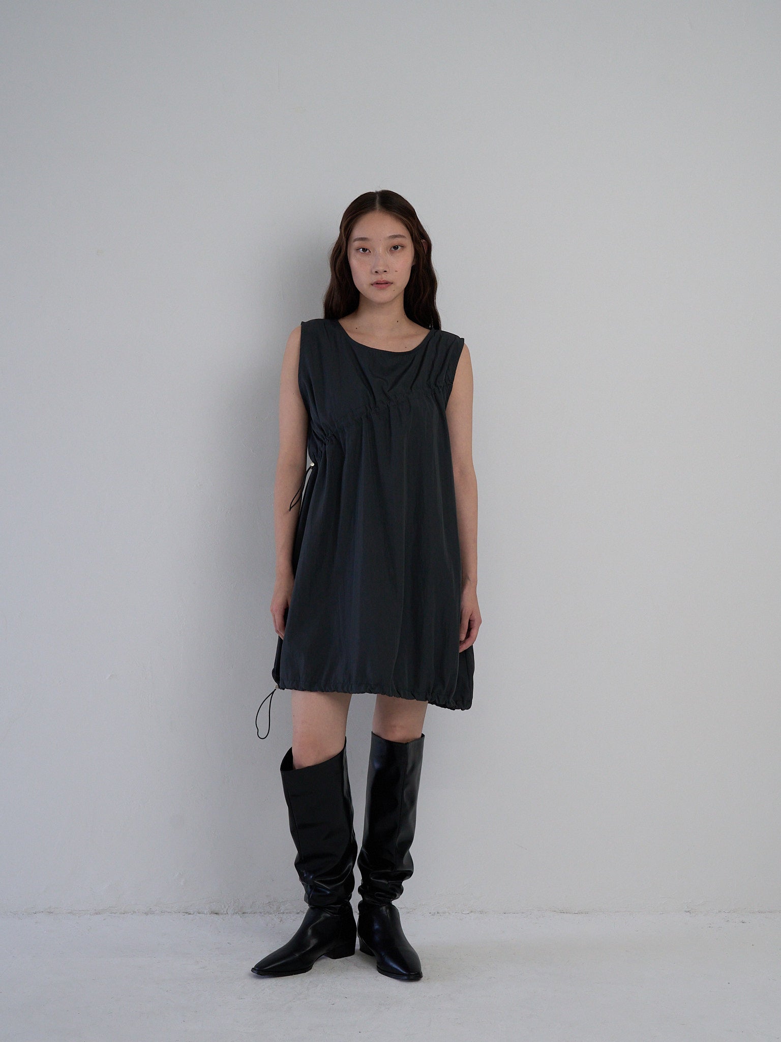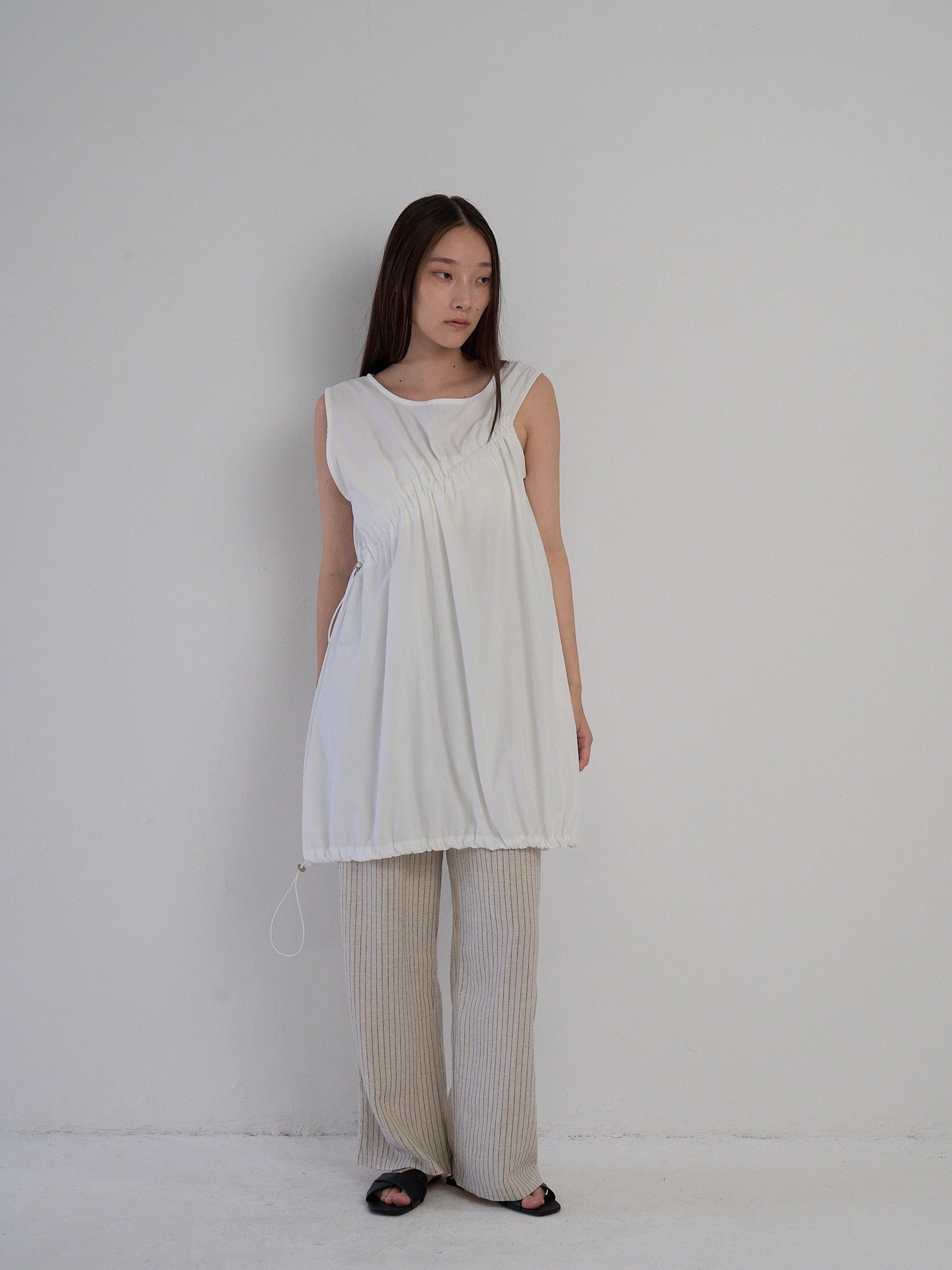 胸元と裾に施されたドローストリングを