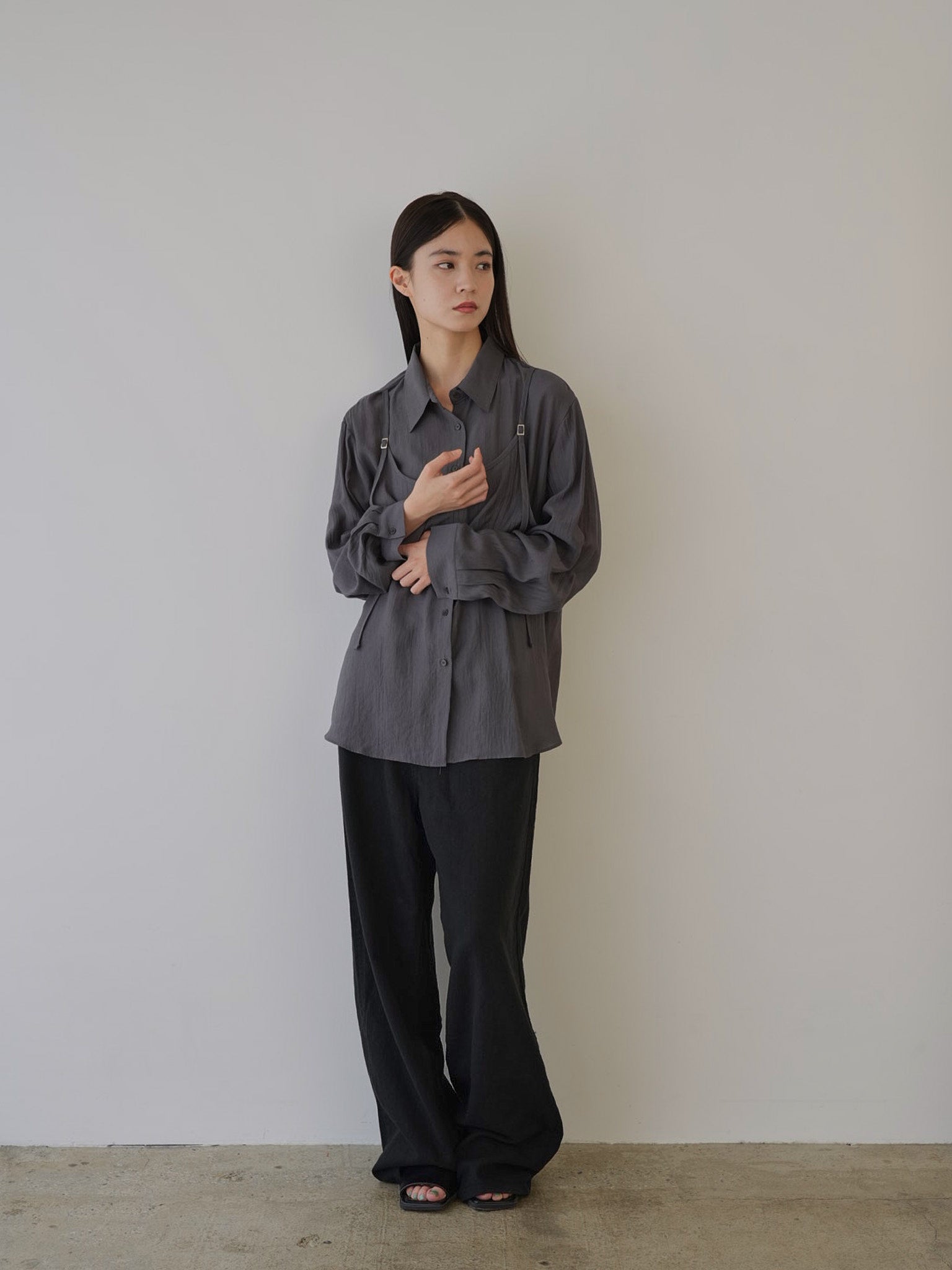 細めのストラップとギャザーがアクセントに。