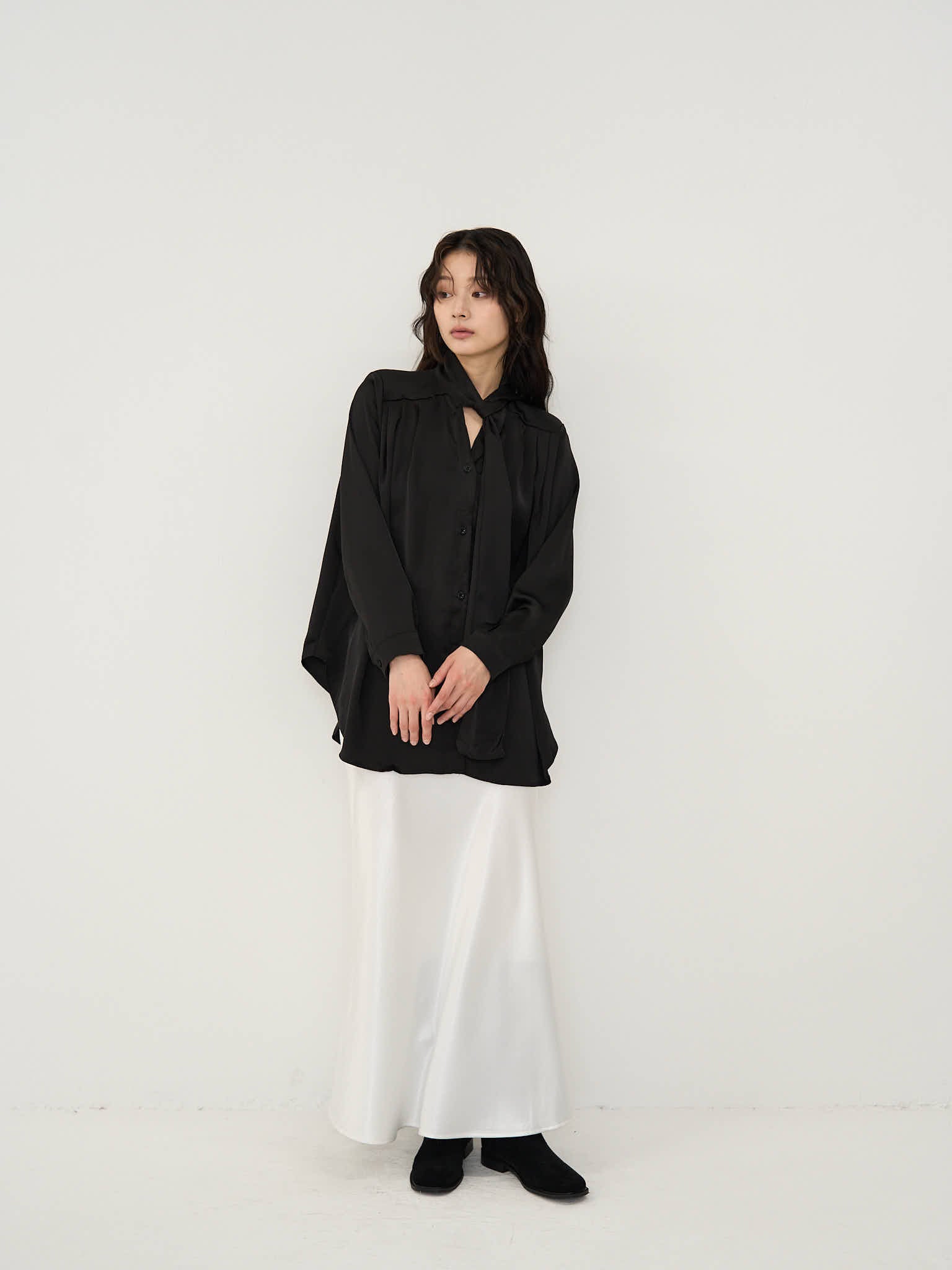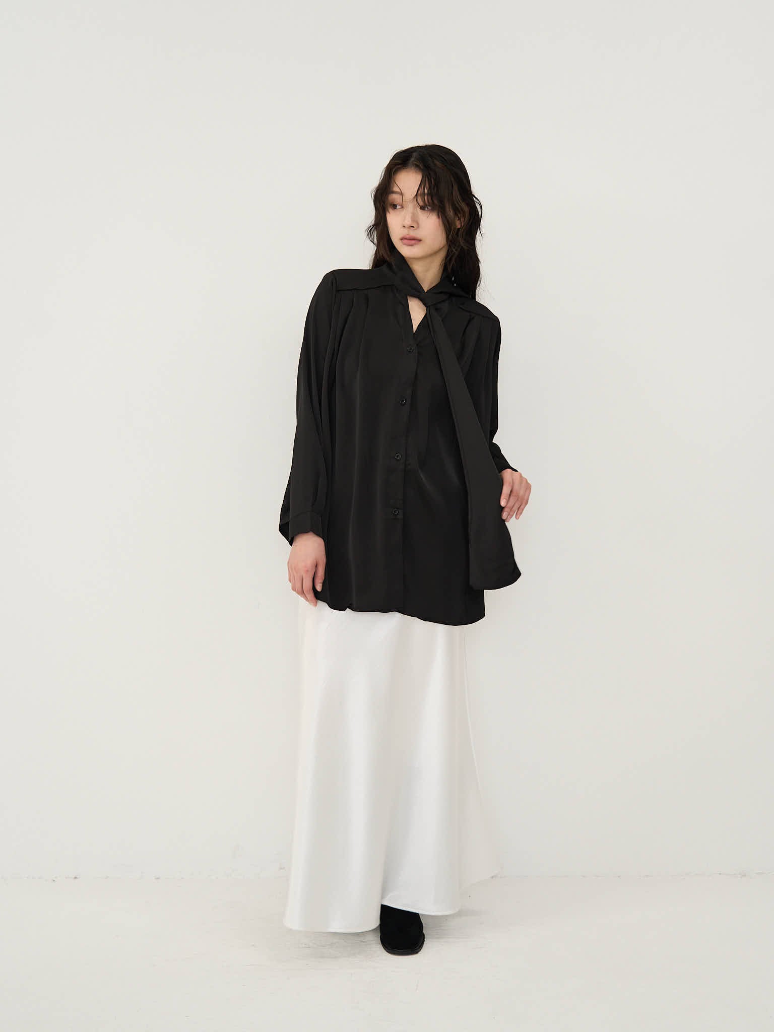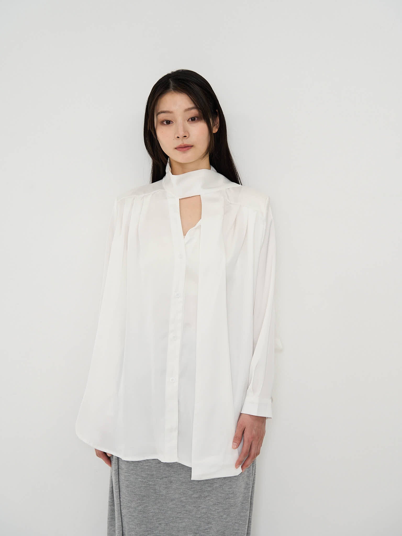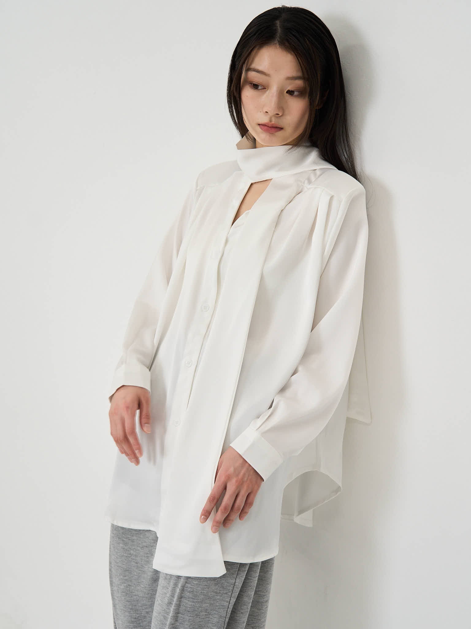 首元にあしらわれたスカーフのディテールが、