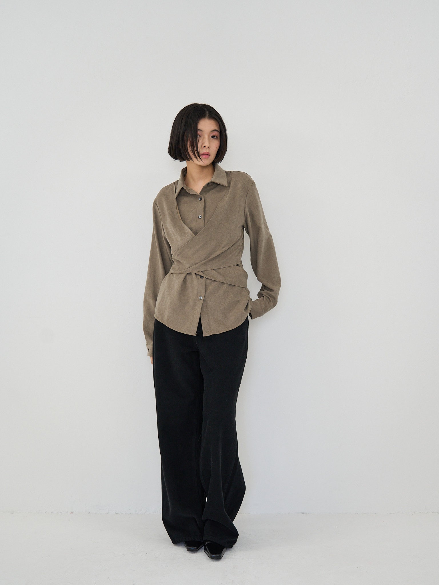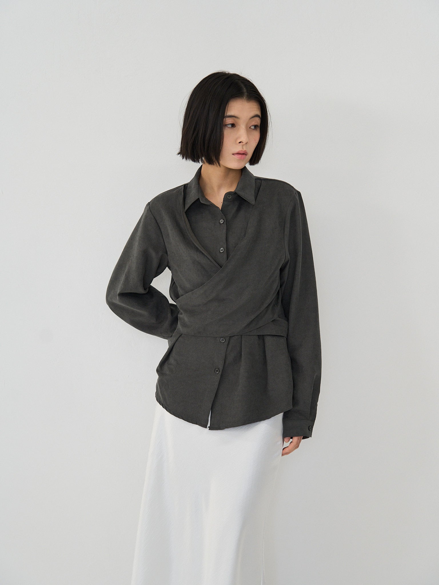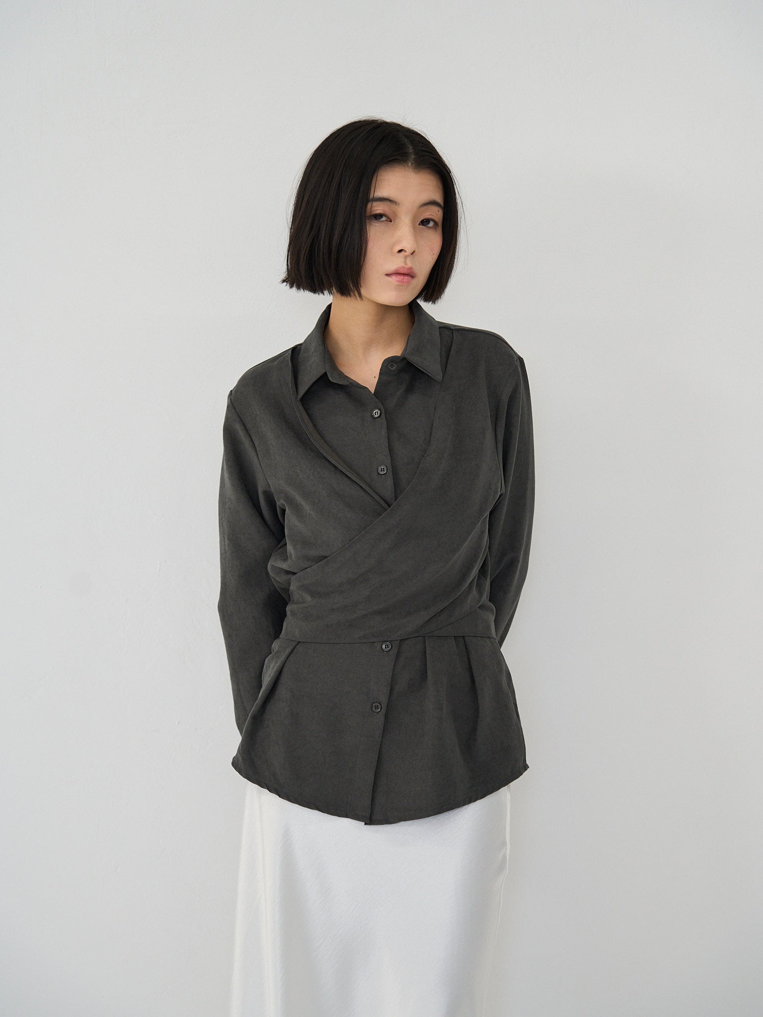上品な印象のラップデザインブラウス。