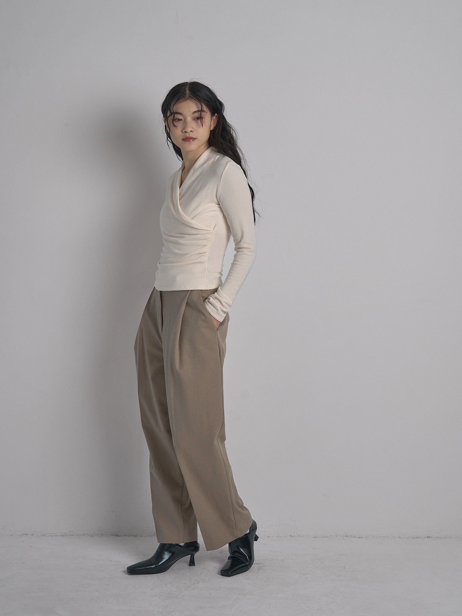ウエストに施されたシャーリングが
